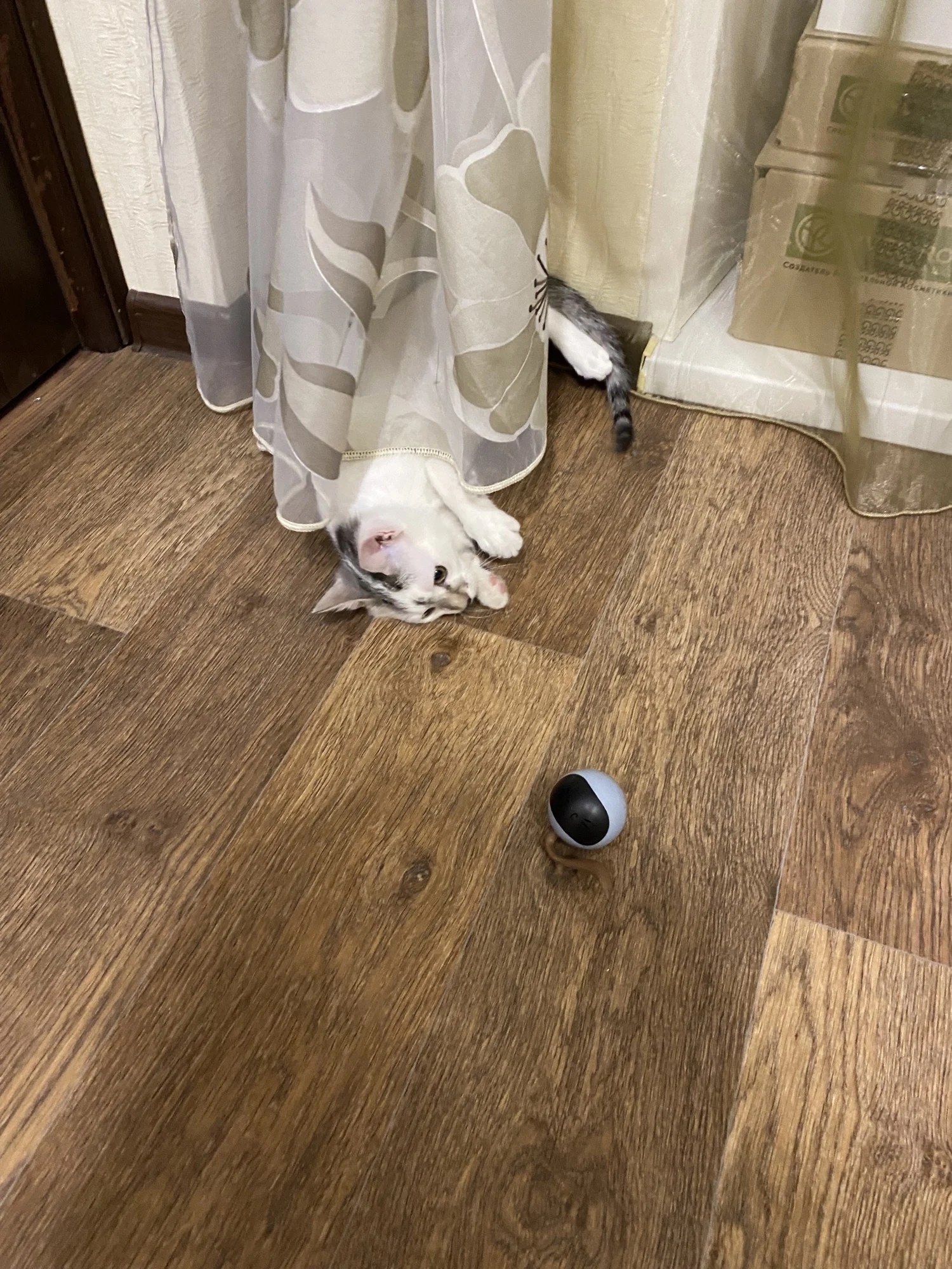 The ball is cool)) came for 2 weeks, charged for 40 minutes, maybe less. The ball is worn, like a shizanovy and multi-colored flashing))) on the laminate grumyashat so that my husband and I are already in a hurry). But on the parquet noise at times less (maybe even if at night the cat will drive this ball, then it will not be particularly heard) .. But by laminate-it’s kanesn tryndets is the most complete in terms of noise. Fully charged ball almost without problems overcome the threshold from the Parquet to the carpet (with a short dense pile). The ball is worn chaotic, stumbling on the solder, changes the trajectory. Rolling under the furniture, without problems rolls out later to the open space (the main thing is that it does not stop there))))). The cat is frightening, but this toy was taken with curiosity)). For an hour 1,5 we chased this ball around the apartment, the cat was only watching, although the ball and the cat were worn away, and the cat was hiding from his ass). That later will get used to the toy and will play✅